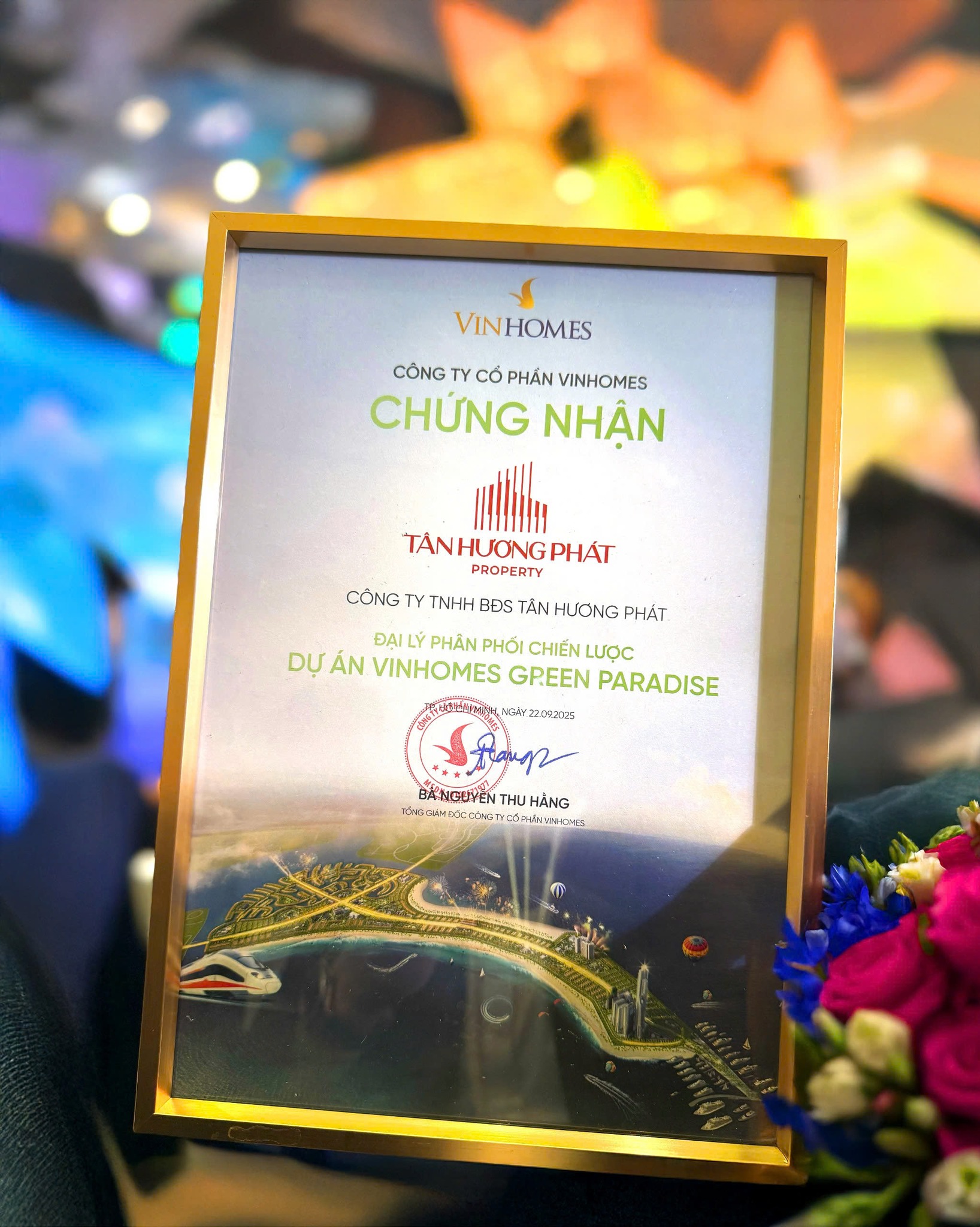 Tân Hương Phát Property vừa chính thức trở thành Đại lý phân phối F1 của dự án Vinhomes Green Paradise – siêu đô thị biển Cần Giờ. Đây được xem là bước tiến quan trọng, khẳng định uy tín và vị thế tiên phong của Tân Hương Phát trong lĩnh vực phân phối bất động sản cao cấp.