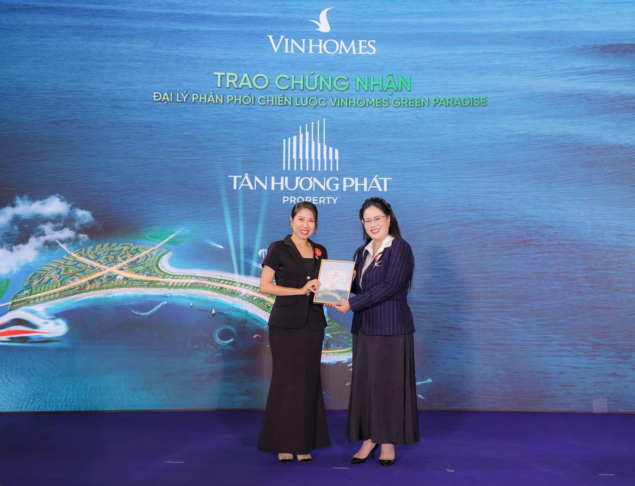 Bà Đinh Thúy Hương – CT HĐQT Tân Hương Phát Property nhận chứng nhận Đại lý F1 Vinhomes Green Paradise Cần Giờ từ CĐT Vinhomes